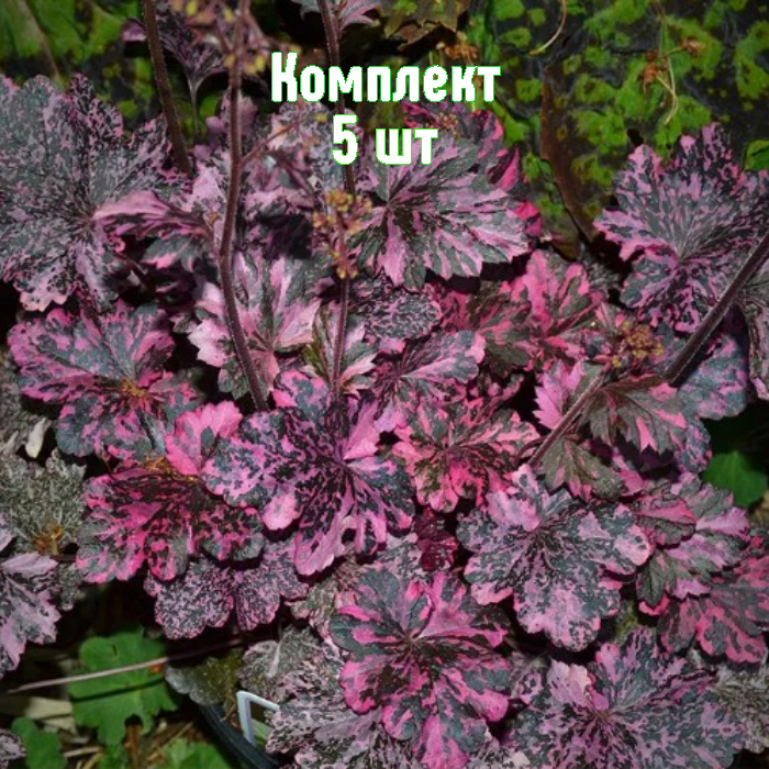 Комплект из 5 саженцев гейхеры мелкоцветковой Midnight Rose (Midnight Rose Select) — выгодное предложение: пять растений по цене четырёх. Растение компактное (высота около 30 см, диаметр до 40 см), вечнозелёное многолетнее, быстро образует густой ковёр. Главная декоративная ценность — глянцевая тёмно-шоколадная листва с розово-малиновой крапинкой и пурпурные цветоносы; цветение раннее, июнь–июль, с мелкими бледно-розовыми соцветиями.